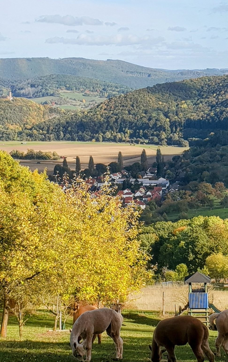 Alpaka Yoga oberhalb von Wendershausen: Tiefenentspannung mit Zwei-Burgen-Blick: